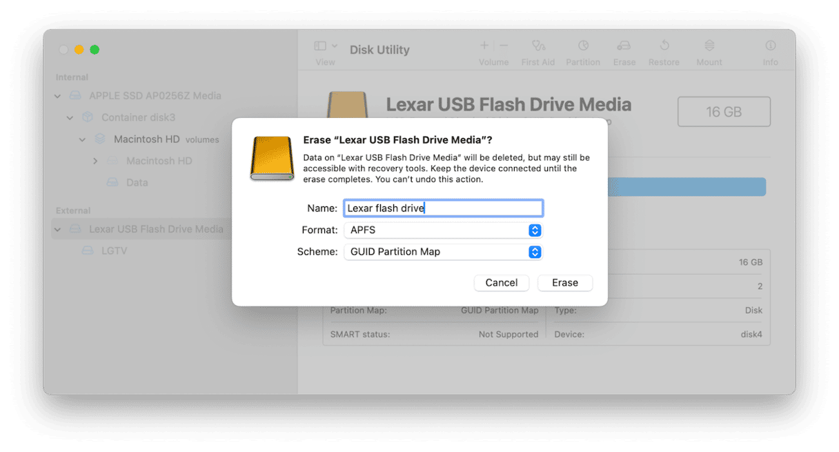 - 為磁盤命名並選擇格式 - 您應該選擇 APFS,除非您有充分的理由不這樣做。