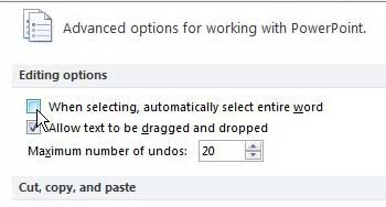 但是,Powerpoint 2010 中的某些設置可能會讓您覺得煩人,其中包括當您將鼠標拖動到單詞中的幾個字母上時強製程序自動選擇整個單詞的設置。