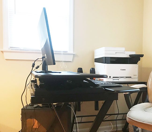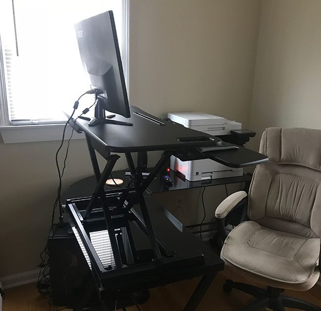 上面的圖片顯示了帶有顯示器、鍵盤和鼠標的桌子。這就是我在大多數情況下使用辦公桌的方式,因此它可以讓您真實地了解站立式辦公桌工作站如何適應您的典型工作環境。當桌子處於坐姿時,鍵盤距我安裝工作站的桌子表面約一英寸。這與我在安裝工作站之前使用桌子的感覺非常相似,我什至不需要改變椅子的高度位置。