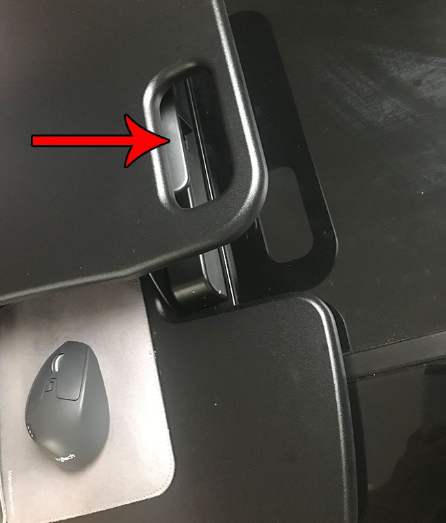 幸運的是,TechOrbits Rise-X Pro 站立式辦公桌工作站就是這種情況,並且是通過可通過設備右側的手柄操作的控制桿來實現的。您只需抓住控制桿,讓它升到站立位置,或者抓住控制桿,向下推桌子,使其恢復到坐姿。槓桿如下圖所示。
