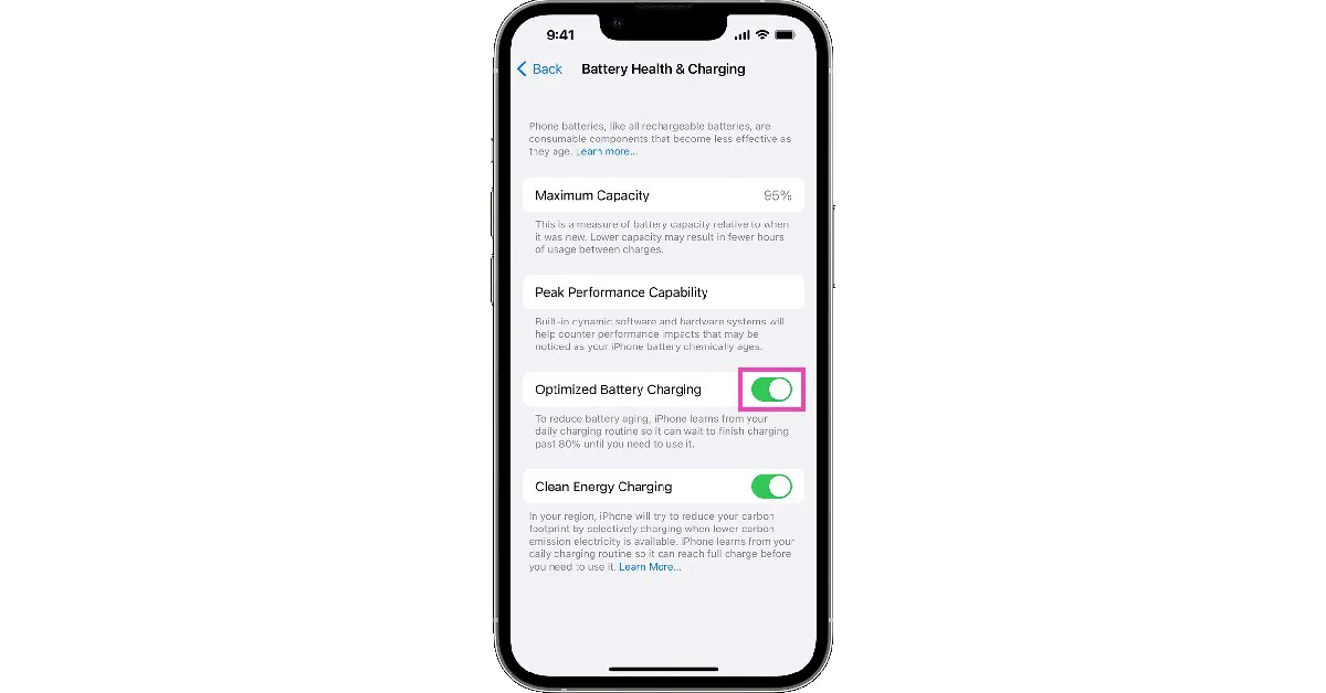 手機電池中的電流過大可能會永久損壞電池。如果你讓手機充電過夜,勢必會對電池健康造成影響。 iPhone 有一項名為“優化電池充電”的出色功能,適合那些需要整晚為手機充電的人。您可以通過訪問找到它設置>電池>電池健康與充電。打開“優化電池充電”後,您的 iPhone 將觀察您的充電模式。如果您給手機充電一整夜並在醒來後立即將其拔出,您的 iPhone 將以正常速度將電池充電至 99%,然後慢慢地為剩餘的 1% 充電,直到您醒來。這可以防止過多的電流流入電池。