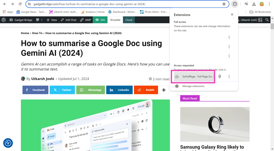 步驟3:單擊拼圖圖標在地址欄旁邊,選擇 GoFullPage 擴展。