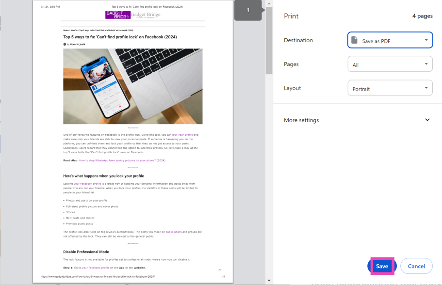 在 Google Chrome 中打開網頁,單擊省略號,選擇“打印”,點擊下拉菜單,選擇“另存為 PDF”,然後點擊“保存”。