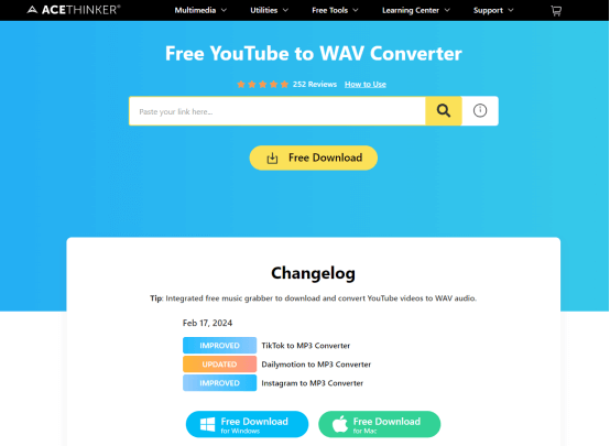 與 downloaderto.com 類似,Acethinker 是一個免費的在線工具,專為YouTube 到 WAV。只需粘貼 YouTube 視頻鏈接,即可立即在線轉換視頻。
