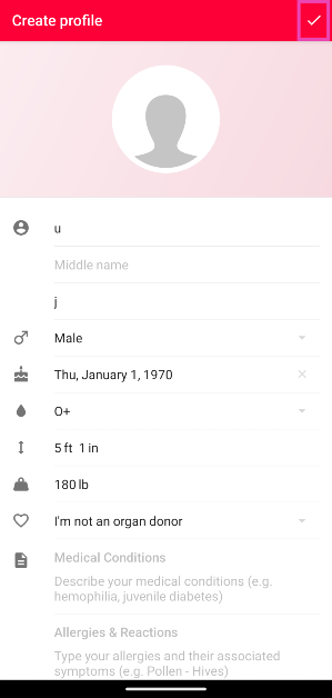 步驟3:填寫資訊例如您的全名、出生日期、性別、血型、身高、體重、醫療狀況、過敏、藥物等等。