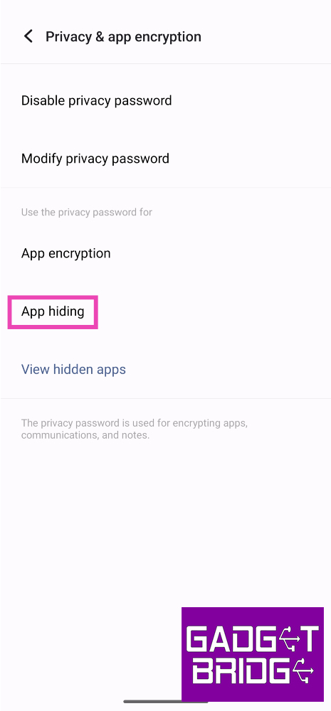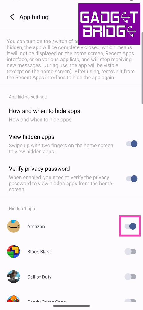 要在 Android 上取消隱藏應用程序,請轉到應用程序隱藏和加密功能,然後關閉要取消隱藏的應用程序的切換開關。