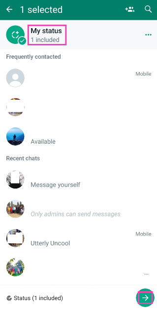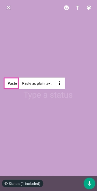 要在 WhatsApp 上設置空白狀態,請將空白字符複製到剪貼板 (⠀),將其粘貼到新狀態頁面,然後點擊發送。