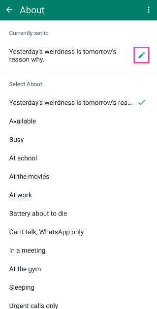空白的“關於”部分是許多 WhatsApp 用戶經常詢問的問題。最初,在消息平台推出類似 Instagram 的故事之前,“關於”部分曾經是您的 WhatsApp 狀態。您的“關於”是讓人們了解您在做什麼的快速方式。如果您處於網絡狀況不佳的區域並且無法立即接收 WhatsApp 消息,您可以為其設置適當的更新。