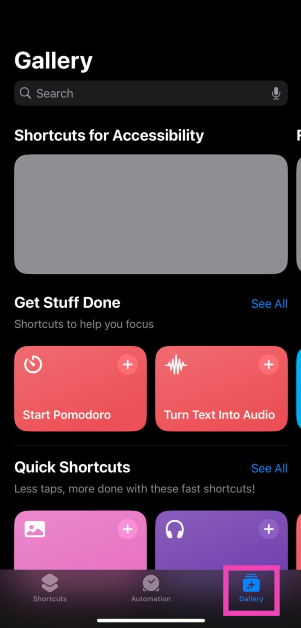 步驟一:啟動快捷方式應用程序在您的 iPhone 上並切換到畫廊選項卡。