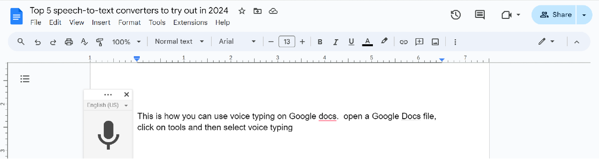 如果您不想在 PC 上安裝語音到文本轉換器工具,則只需使用 Google 文檔上的本機語音輸入功能即可。當您在旅途中找不到穩定的地方來放置筆記本電腦和打字時,這會非常方便。 Google Doc 的語音輸入工具並不完美,但它可以完成工作。聽寫完文本後,您需要清除錯誤,但對於免費工具來說,這已經是最好的了。