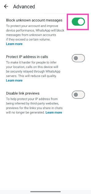 前往設置>隱私>高級然後打開“阻止未知帳戶消息”旁邊的切換開關。