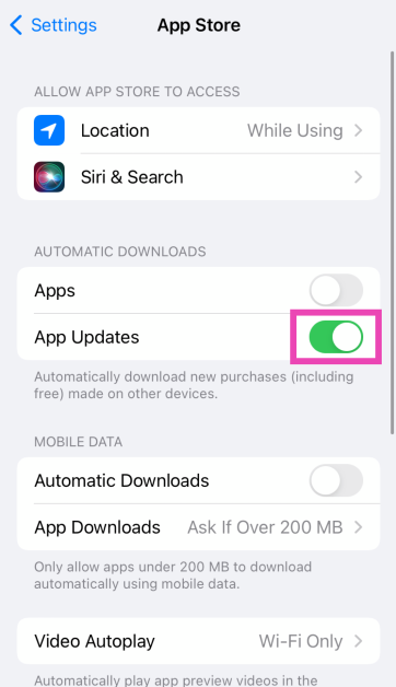 前往設置>應用商店然後打開“自動下載”下“應用程序更新”旁邊的切換開關。