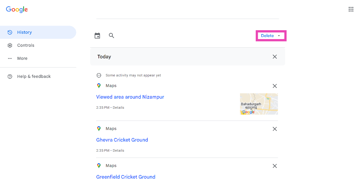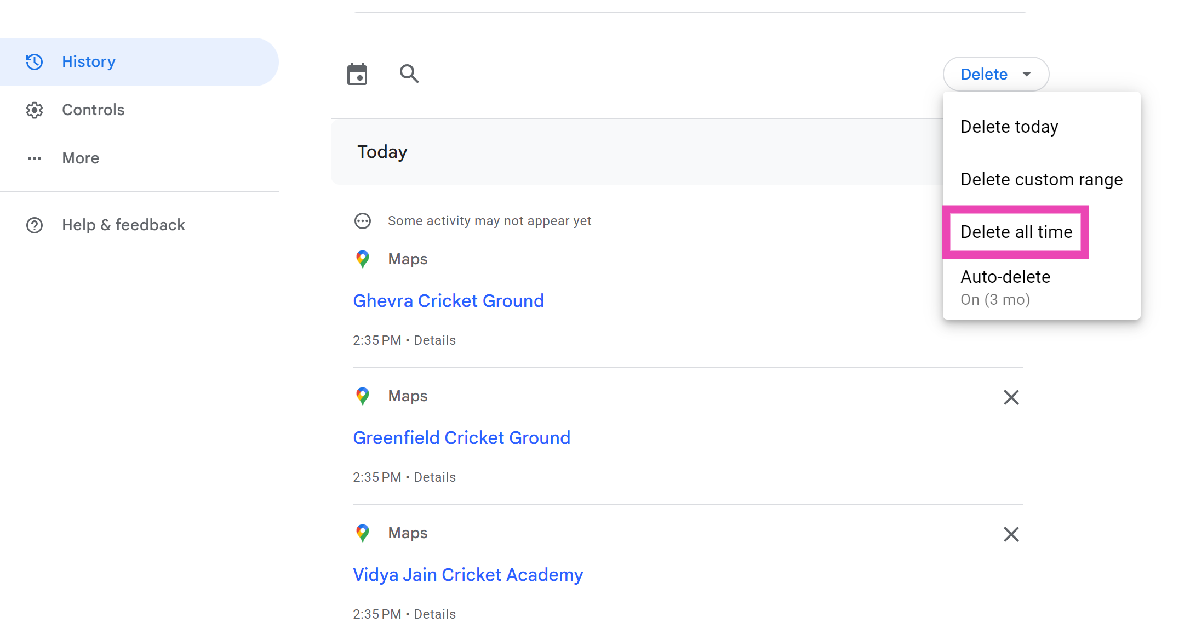 使用電腦上的網絡瀏覽器轉到 Google 地圖,點擊漢堡菜單,選擇“地圖活動”,點擊“刪除”下拉菜單,然後選擇“全部刪除”。