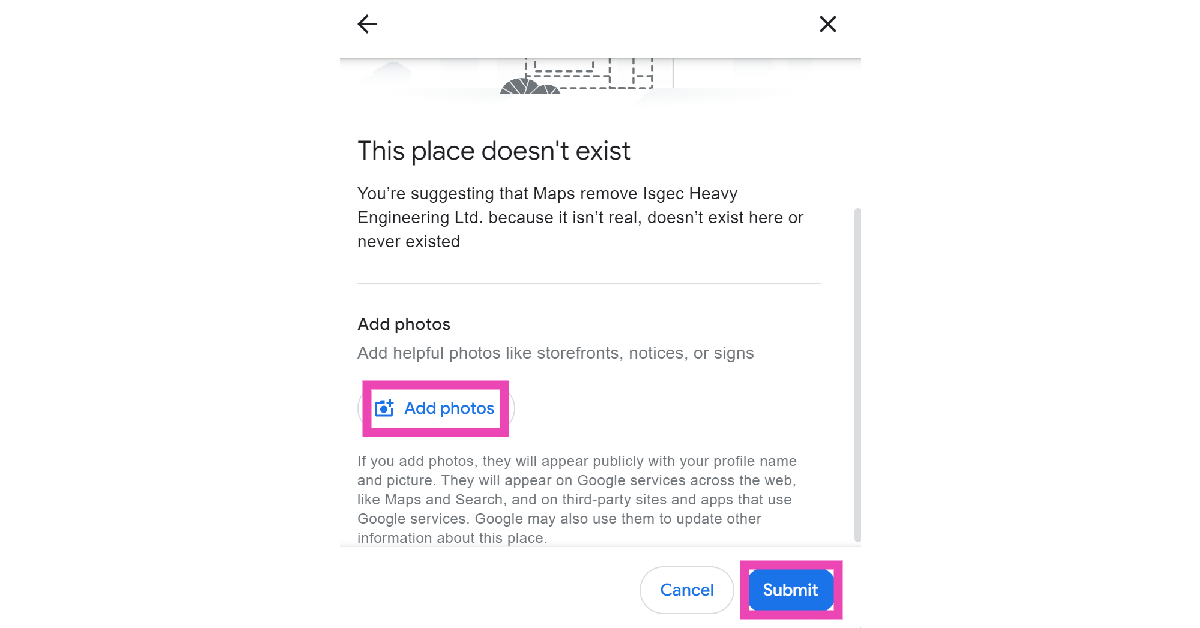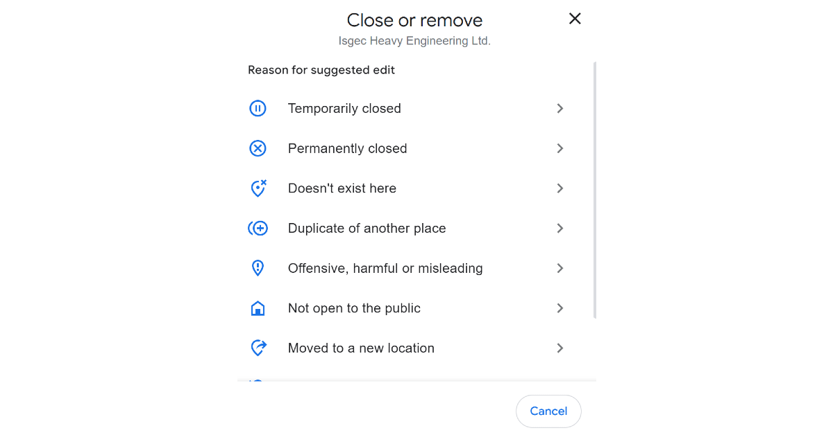 Google 地圖允許您編輯您的公司地址或將其從地圖上完全刪除。只有擁有該商家信息的人才能執行此操作。如果您遇到地圖上列出的商家但已不再運營,您可以向 Google 報告。對於在錯誤位置列出的企業也可以執行相同的操作。在進行編輯時,Google 會要求您用圖像補充報告。一旦信息得到驗證,營業地點將被更改或從地圖上刪除。