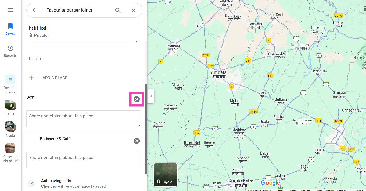 要刪除已保存的位置,請打開 Google 地圖應用程序,轉到“已保存”,選擇列表,點擊“編輯”,然後點擊要刪除的條目旁邊的十字圖標。