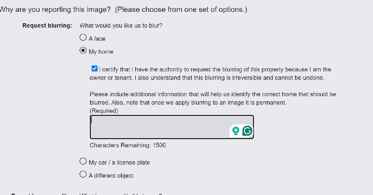 雖然你不能完全刪除一個地方谷歌街景,如果您不希望您的房子出現在那裡,您可以隨時發送模糊請求。請求發送後,Google 將與您聯繫並驗證您是否居住在您選擇的位置。