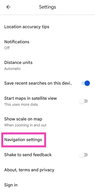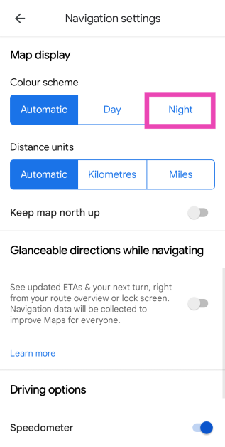 啟動 Google 地圖應用,點擊您的個人資料照片,轉到“設置”,點擊“導航”,然後在“顏色方案”類別中選擇“夜間”。
