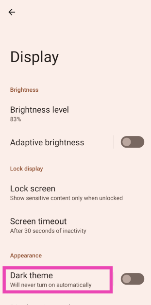 前往設置>顯示並打開“深色模式”的切換開關。如果您想設置其時間表,請點擊黑暗模式。