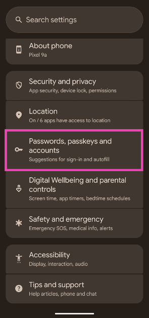步 1:前往設定並選擇密碼、密鑰和帳戶。