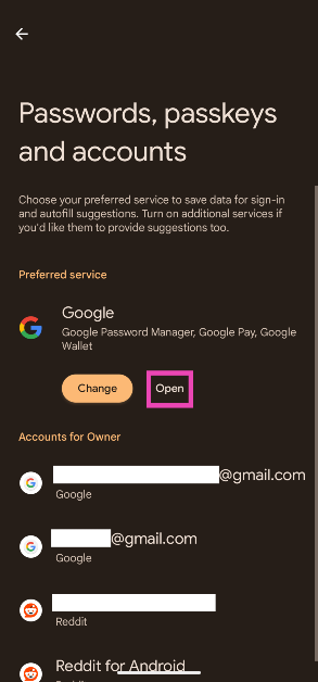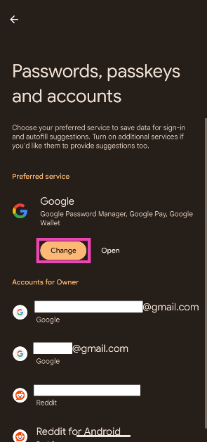 前往設置>密碼、密鑰和帳戶,點擊 Google 下的“更改”,然後選擇您喜歡的第三方應用程序。