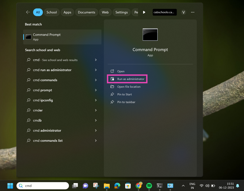 要在 Windows 11 電腦上以管理員身份運行命令提示符,只需在任務欄的搜索框中鍵入“CMD”,然後從應用程序選項中選擇“以管理員身份運行”。