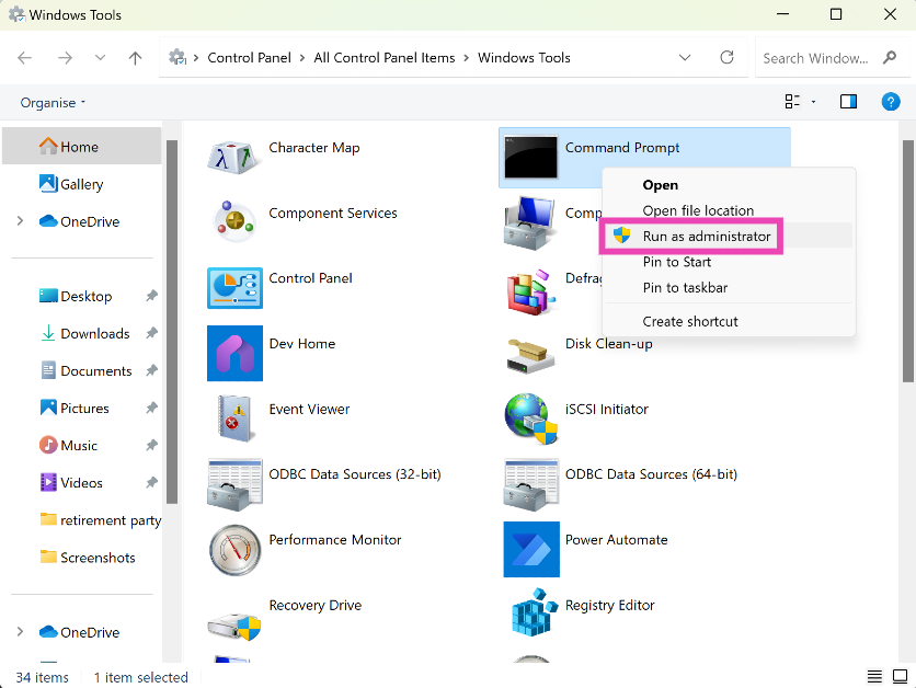步驟2: 右鍵單擊在命令提示符並選擇以管理員身份運行。