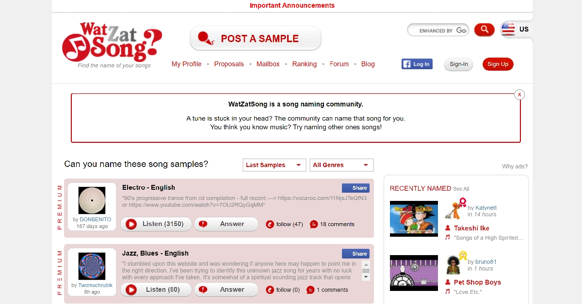 瓦扎特頌是一個擁有超過 400,000 人的社區,致力於尋找您腦海中的歌曲。要發布歌曲樣本,您需要先註冊。由於用戶群體多元化,搜索英語以外語言的歌曲變得非常容易。找到與您的查詢正確匹配的內容後,您也可以留下來幫助其他用戶滿足他們的請求。 WatZatSong 也是討論所有音樂問題的好地方。它的論壇整齊地分為不同的歌曲流派。一旦你正確猜出一首歌曲,你就會獲得一些積分。匹配次數最多的用戶會在網站上排名。
