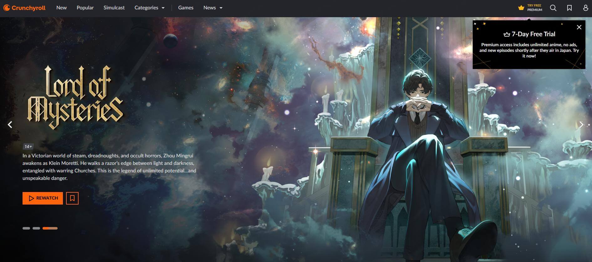Crunchyroll 專注於提供合法授權的動漫內容,提供免費(廣告)和付費選項。