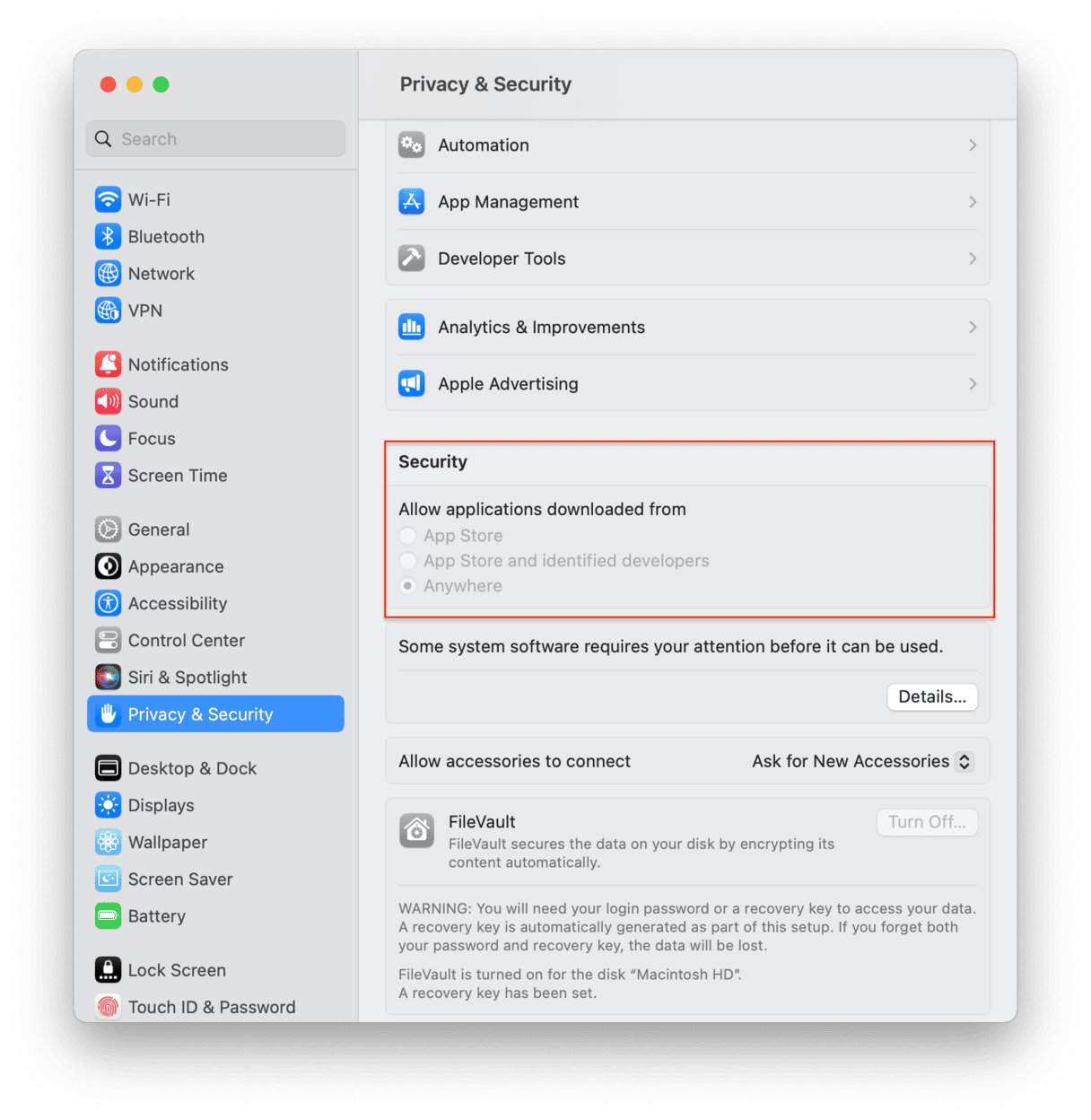 sudo spctl --master-disable並按回車鍵。輸入您的 Mac 密碼。 - 轉至系統設置 > 隱私和安全 > 安全。您將看到“允許從自動選擇的任意位置下載應用程序”。