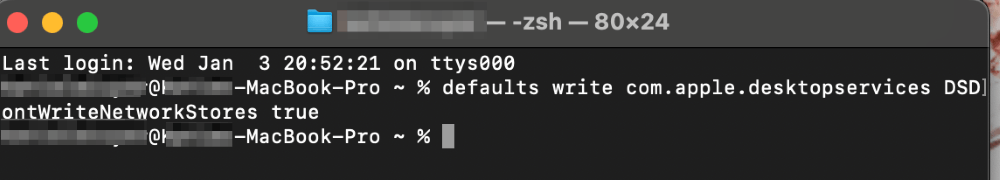 defaults write com.apple.desktopservices DSDontWriteNetworkStores true