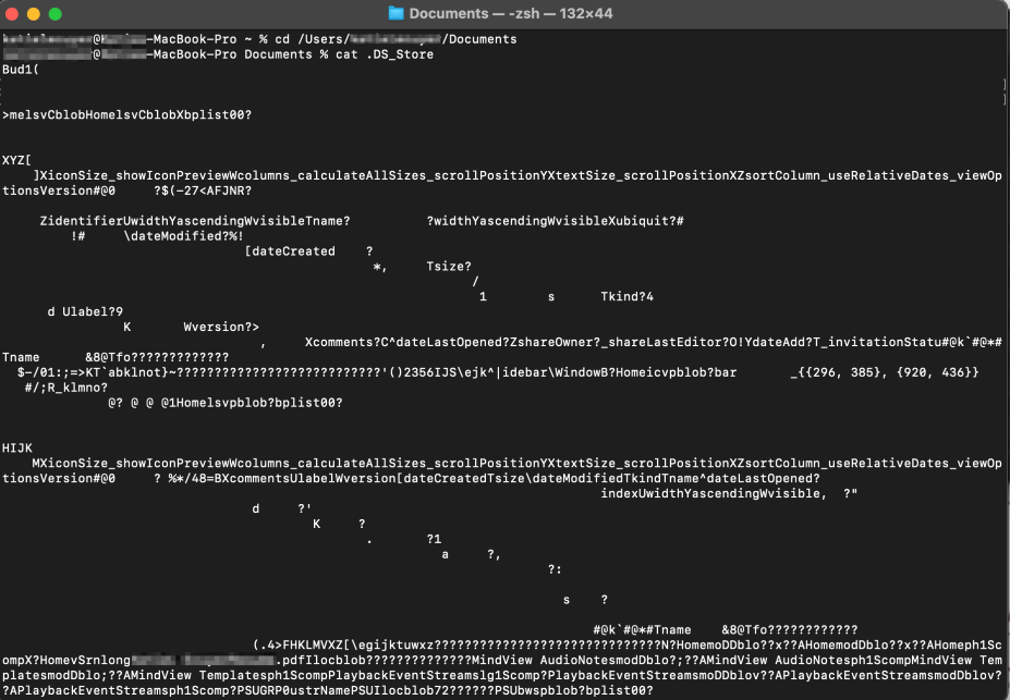 不幸的是,使用典型的“取消隱藏文件”終端命令或鍵盤敲擊無法查看 .DS_Store 文件(此更改是在 macOS Mojave 中進行的)。但是,如果您想查看文件的內容,可以在終端中查看它們。它看起來像這樣: