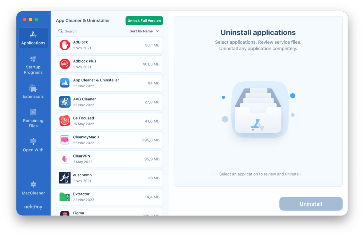 如果您只需要卸載 Mac 上的應用程序,App Cleaner & Uninstaller 是您絕佳的 Mac 清潔軟件替代方案。這款由 Nektony 開發的應用程序卸載程序可讓您刪除應用程序、插件、小部件、啟動應用程序和應用程序相關文件。該應用程序的界面對於新手來說也很乾淨且易於理解。