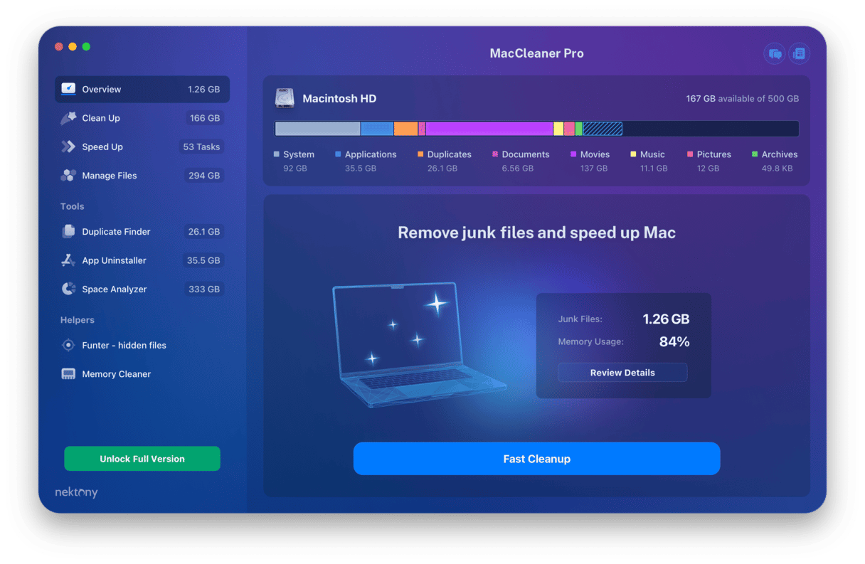Mac Cleaner Pro 是 Nektony 開發的另一個工具,也是 App Cleaner & Uninstaller 的創建者。用戶說他們對該應用程序非常滿意,因為“它實現了其聲稱的功能,並且使用戶可以輕鬆使用它。” Mac Cleaner Pro 基本上是 Mac 的清理和加速工具。安裝並啟動該應用程序後,您將看到帶有彩色存儲類別的詳細圖表,類似於您在 Mac 上的“關於本機”部分中看到的圖表。