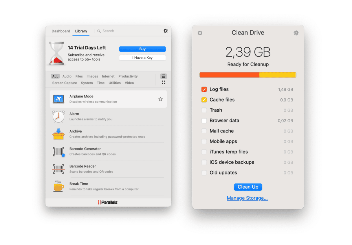 Parallels Toolbox 本質上是一組適用於 Mac 的工具。它包含超過 55 個實用程序,可讓您在 Mac 上快速執行日常任務,例如捕獲屏幕截圖、錄製音頻、設置計時器和清理驅動器等。考慮到可用工具的多樣性,Parallels Toolbox 更多的是一個優化工具,而不是一個清理軟件。