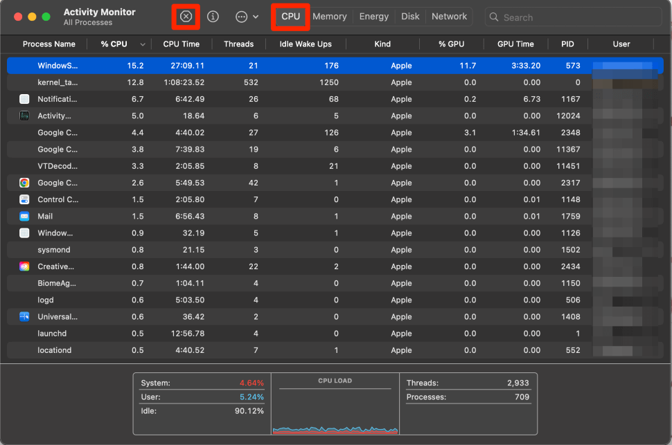 - 檢查CPU使用率查看 Mac 的處理器資源是否被不需要的或出現故障的應用程序佔用。