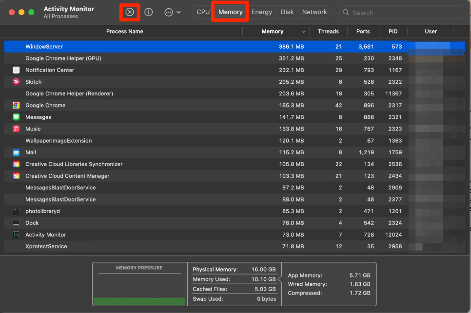 這記憶底部的壓力監視器對此很有幫助,因為它會顯示內存壓力是否過高。如果您需要退出任何應用程序,因為它佔用了太多內存(或者只是想退出它),請使用屏幕左上角的 X。