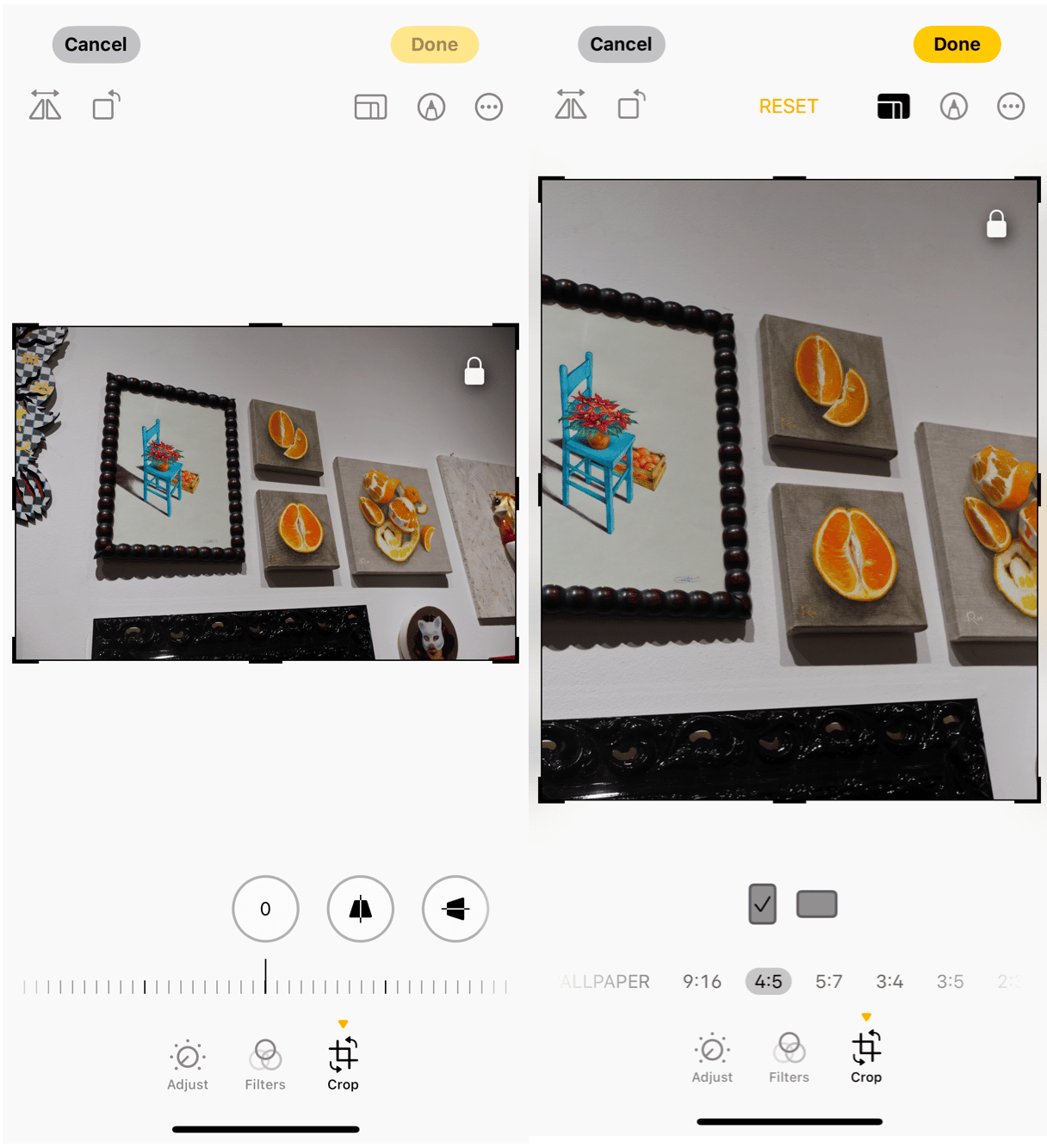 - 點擊屏幕左下角的小裁剪圖標即可以縱向或橫向模式查看照片。