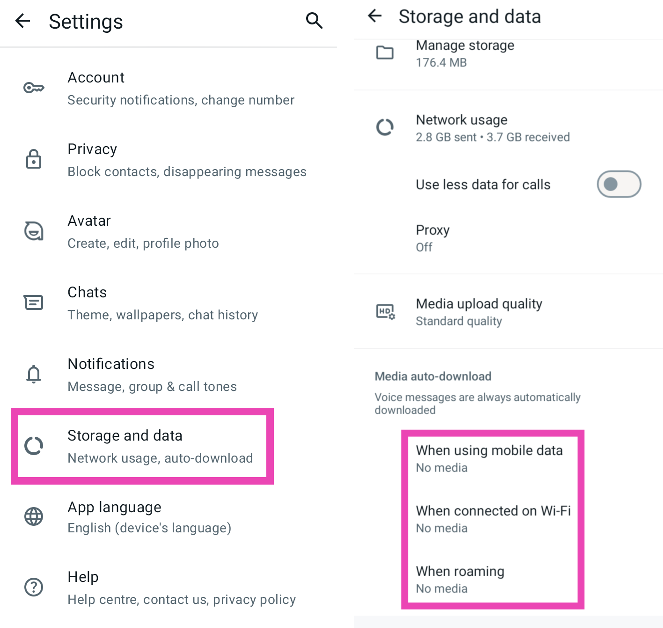 啟動 WhatsApp,前往設置>存儲和數據>媒體自動下載並取消選中所有三個類別中的所有框。