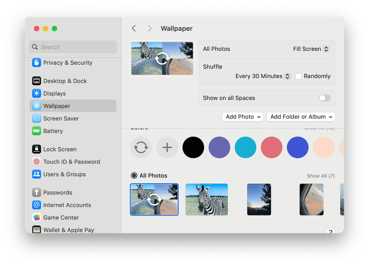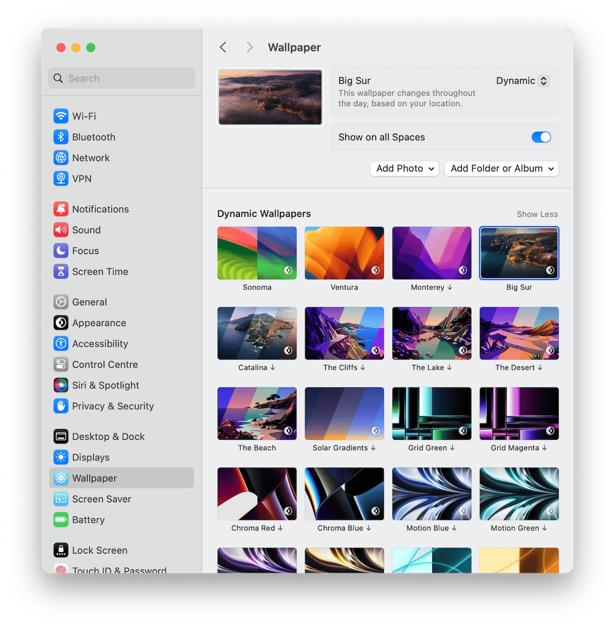 您還可以使用自己的圖像作為動態壁紙,無論是來自“照片”中的相冊還是 Mac 上的文件夾。