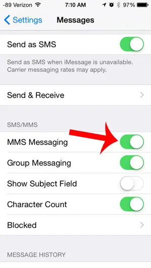 步驟 3:向下滾動並觸摸右側的按鈕彩信消息。當按鈕周圍有綠色陰影時,您就知道它已打開。