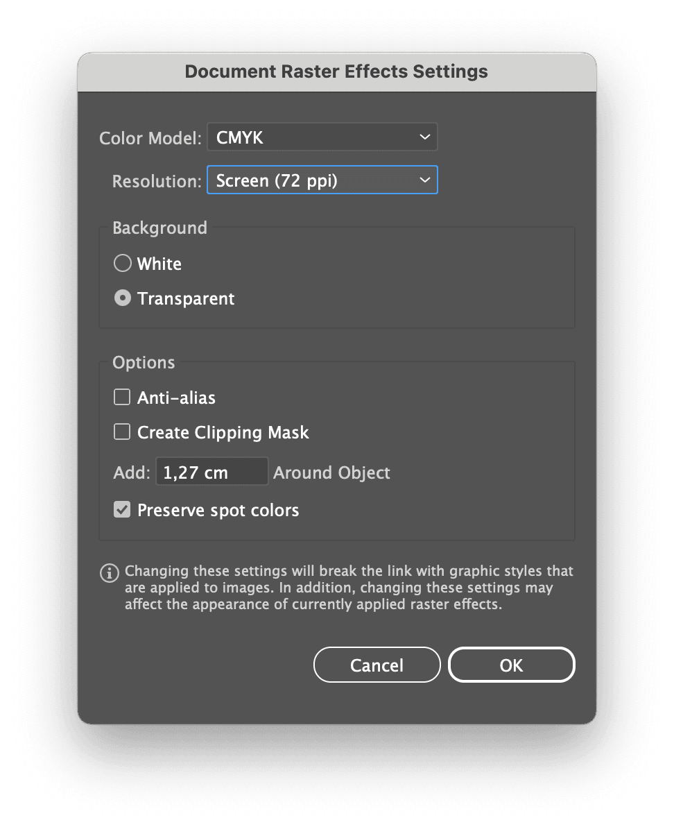 較低的光柵效果設置:轉到效果 > 文檔光柵效果設置,然後選擇較低的分辨率。