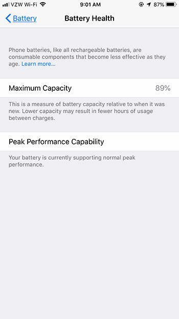 請注意,隨著手機和電池的老化,容量會逐漸耗盡,這是正常現象。如果此菜單的底部表明電池正在以峰值容量運行,那麼您的電池可能狀況良好。