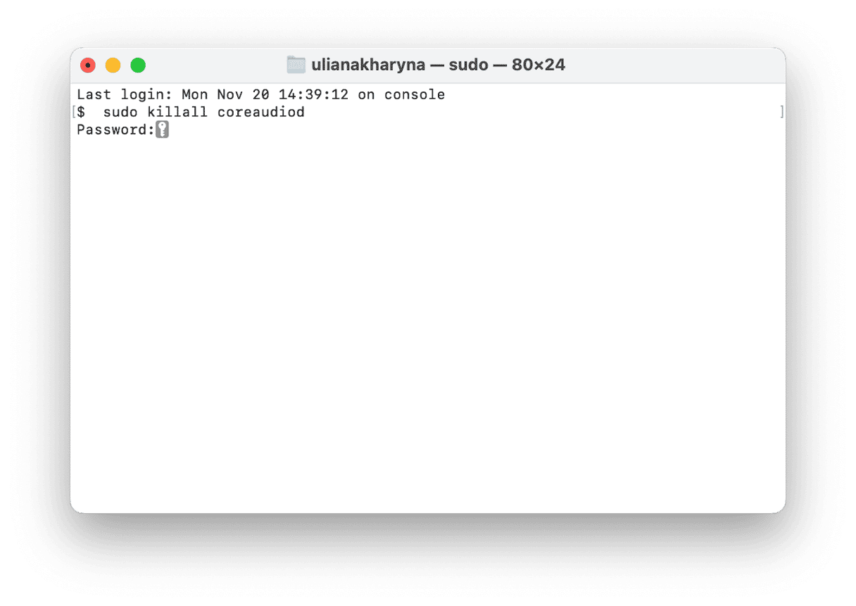 sudo killall coreaudiod - 按 Return 鍵並根據要求輸入您的管理員密碼。