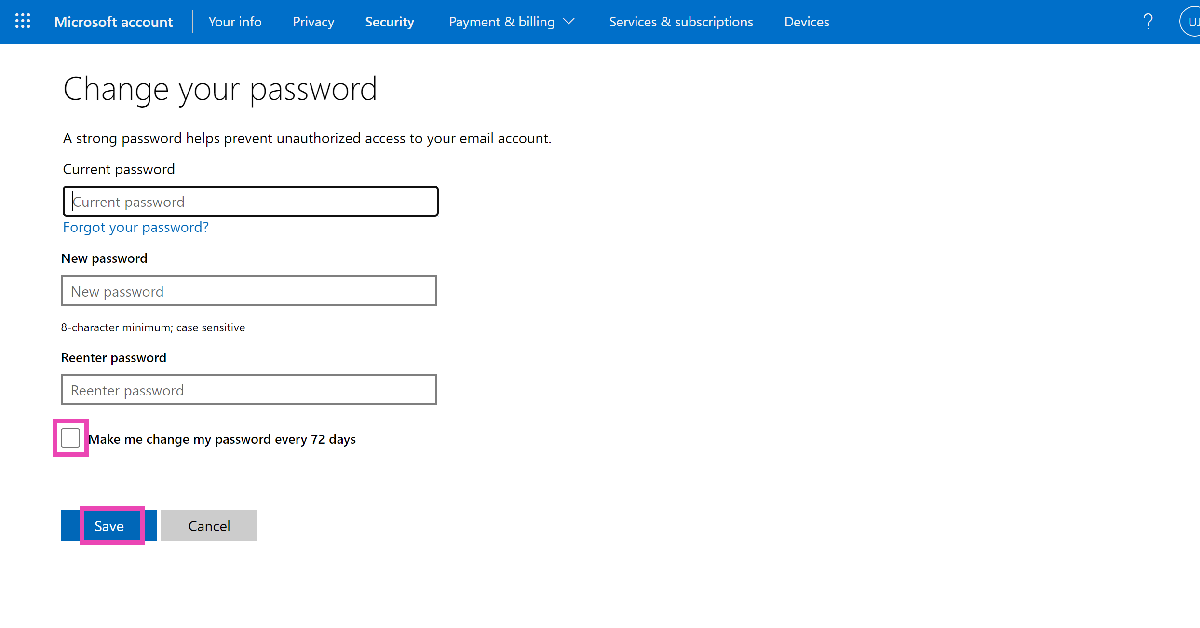 第4步:取消選中該框讓我每 72 天更改一次密碼。打節省。