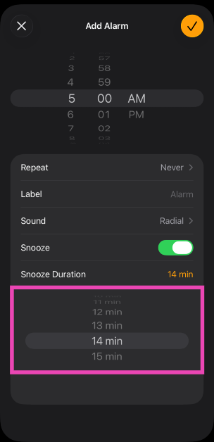 啟動 iPhone 上的“時鐘”應用程序並切換到“鬧鐘”選項卡。選擇一個現有警報或創建一個新警報。點擊“暫停”並使用滑塊設置新的持續時間。完成後點擊勾號圖標。