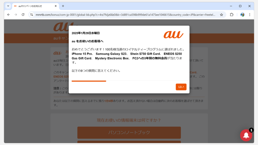 本來是DOCOMO的活動,僅限100人,但我最終看到了“au活動通知”,並且陌生的網站名稱mmrtb.com仍然留在我的瀏覽歷史中。