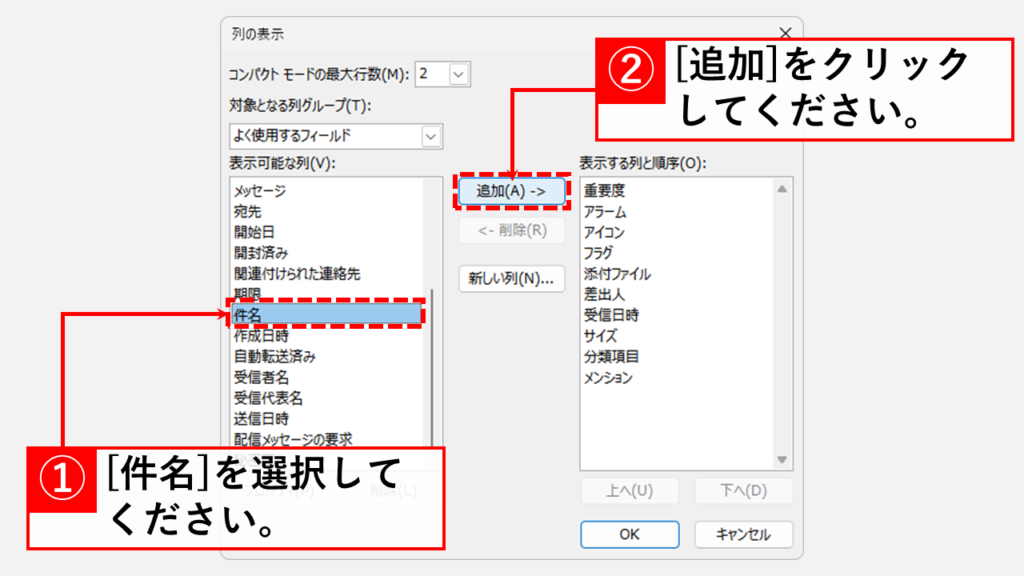 如果重置不能解決問題,請在 Outlook 的“查看設置”中手動添加主題字段。您可以選擇要在列表中顯示的列,這樣您就可以只恢復您需要的項目。這只是設置更改,不會影響電子郵件本身。