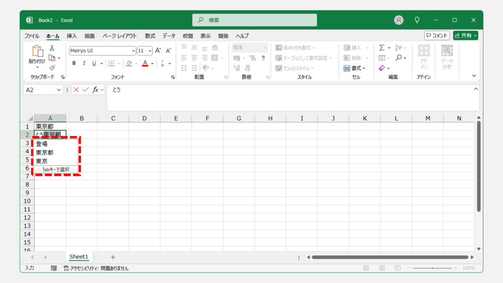 例如,如果在列中輸入“東京”、“大阪”和“名古屋”,如果在新單元格中輸入“and”,則“東京”將顯示為候選。