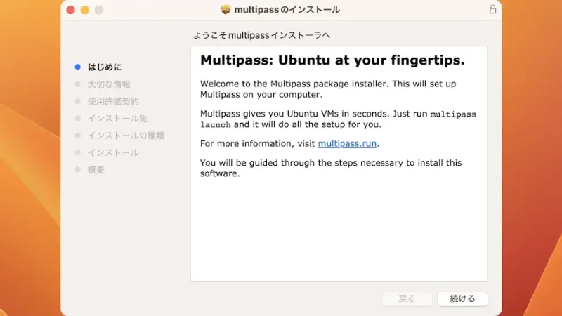 這次,截至2024年7月,我下載了[最新][multipass-1.13.1+mac-Darwin.pkg]。 - 運行下載的文件並安裝它。