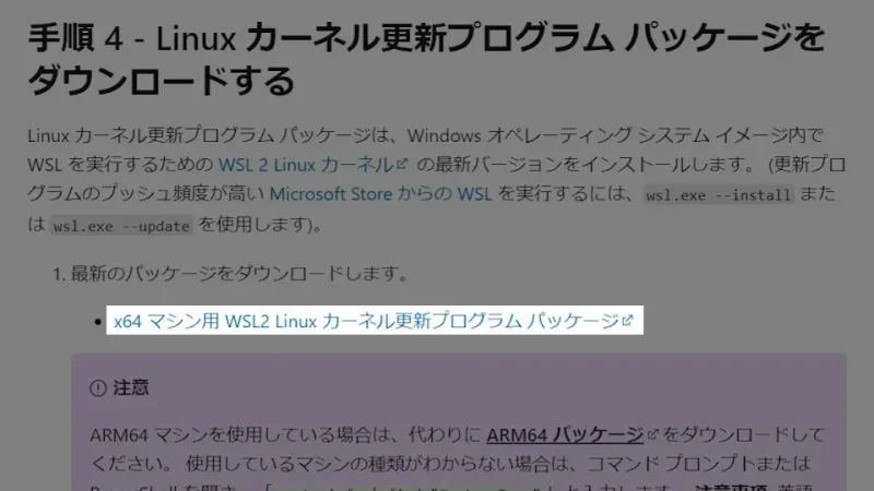 - 單擊“下載 Linux 內核更新包”中的 [WSL2 Linux Kernel Update Package for x64 Machine] 進行下載。
